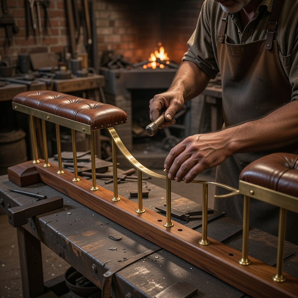 Chez La Maison du Club Fender, chaque pièce est fabriquée à la main par des artisans Compagnons du Devoir, dans notre atelier de Mayenne. Soudures manuelles, cuirs pleine fleur, laiton patiné à la main — nous sommes le seul atelier en France à concevoir et fabriquer des club fenders sur mesure, aux dimensions exactes de votre cheminée.